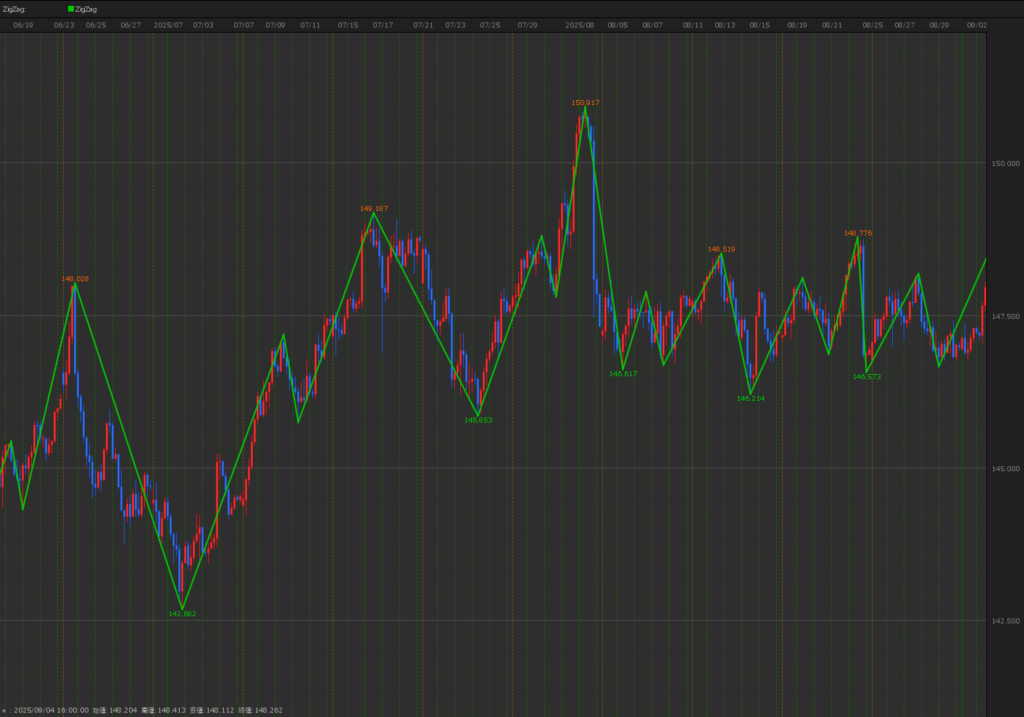 ZigZagは、チャート上の高値・安値を自動抽出してジグザグ線を描くツールです。
