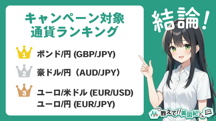 結論、効率よくキャンペーンを攻略するなら通貨ペアは「ポンド/円(GBP/JPY)」または「豪ドル/円(AUD/JPY)」がおすすめです。